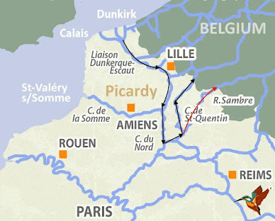 If we were to do this route, we wouldn't make it to the Canal de la Sambre à l'Oise, which would be a pity. For one reason, I would very much like to go to Ors, which is where Wilfred Owen (the war poet) is buried and that's near the canal south of Landrecies. Another reason is that we've never done this section before, which makes it all the more appealing. I'm sorry the maps aren't very clear, but they hopefully give you an idea of the possibilities.
