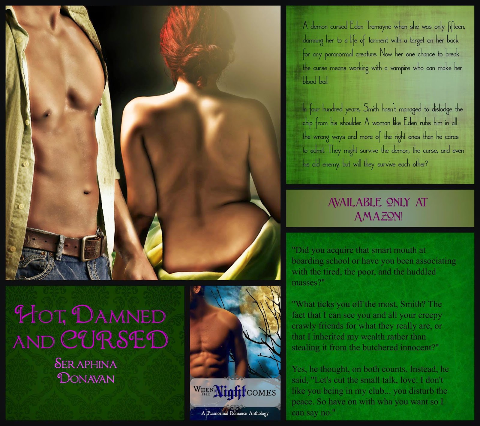 Welcome to a special edition I am running on my blog this week. This collection is sure to warm up your cold nights as these authors offer up men so hot they will make you burn for more. For seven days I will be treating you to seven paragraphs from the seven writers of When the Night Comes. The anthology is available for a limited time on Amazon for only .99 cents so get your e-book today or you can buy the paperback for $13.31. Now here is a taste of the first book in the anthology. Hot, Damned and Cursed by Seraphina Donavan