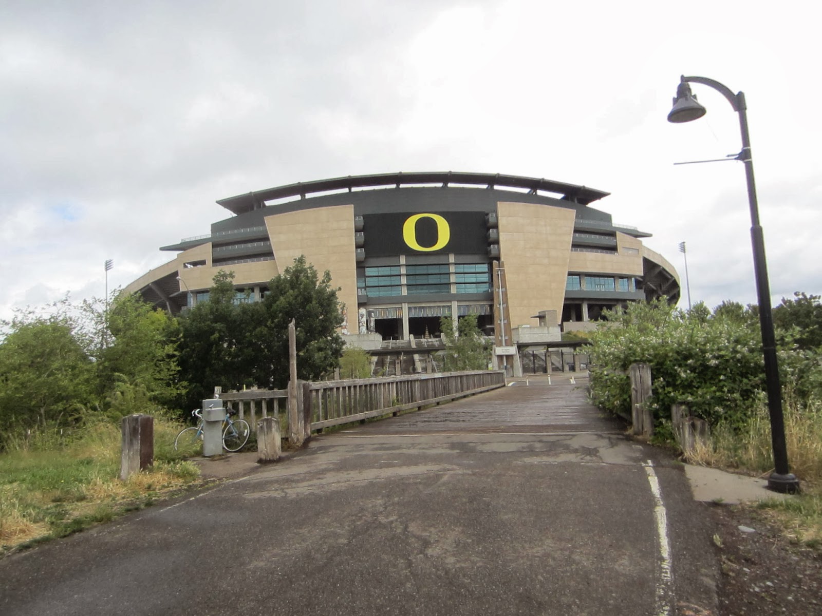 Even though it's a bit painful to put this shot up of Autzen (the Ducks did a total beat down on my Bruins this weekend), it had to be done. Students who live over at the Duck Village apartments (like Emily Ross) cut through the stadium's parking lot to get to campus.