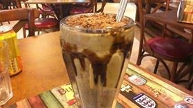 It's a chocolate malt, with chocolate shavings and Oval-tine at my favorite burger joint in Sao Paulo, Brazil. I don't know if it's impolite to slurp. See the chocolate drips down the inside? There was a great, gooey clump of chocolate at the bottom of my glass!