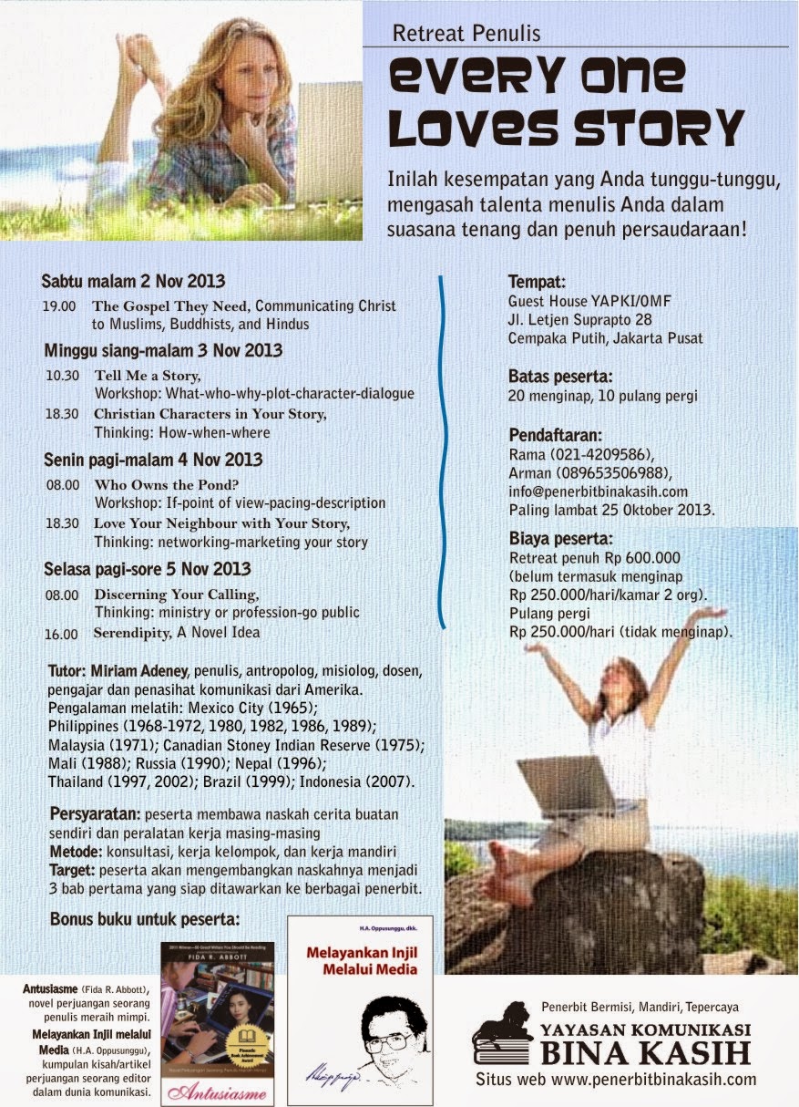 Register and join with other Indonesian Christian Writers at this event: Retreat for Writers, November 2-5, 2013 at Guest House YAPKI/OMF, Letjen Suprapto 28, Cempaka Putih, Jakarta Pusat, Indonesia.