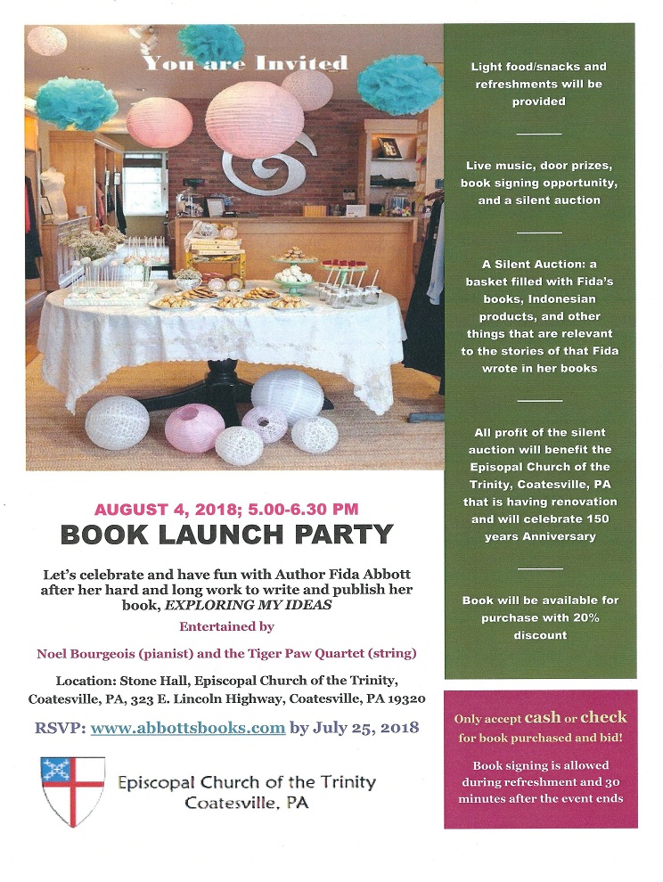 Thank you all who have given responses "YES" or "NO" to attend and not to attend Fida Abbott's Book Launch Party. All guests are special and Fida appreciates your effort and time. Besides family, friends, co-workers, former co-workers, and neighbors, there will be Dean Emeritus of Cheyney University of Pennsylvania who wrote Foreword of Fida's new published book, Former General Manager of YKBK (Indonesian publisher who published Fida's book Enthusiasm in Indonesia) who came from Ohio, Director of Coatesville Area Public Library, Music Director of CASD for Middle School, Rector and Deacon of the Episcopal Church of the Trinity, former Ass. Manager of Walmart in Parkesburg, former Support Manager of Walmart in Parkesburg and former Girl Scouts Troop Leader, etc.