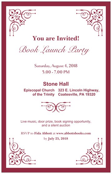 There will be door prize, entertainments with non classical and classical music, and silent auction. The proceeds of this silent auction will benefit the Episcopal Church of the Trinity in Coatesville, PA who is going to celebrate 150 Anniversary and is having renovation. Have fun at Fida Abbott's Book Launch Party amd thank you all for your support.(*)