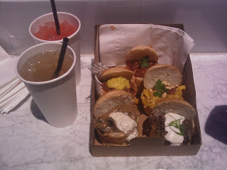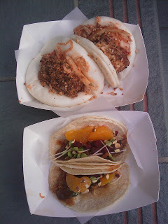 The Flying Pig TruckI have an affinity for dishes like this. I think it has something to do with my identity issues. Imagine peking duck with a lightly spiced red sauce and wrapped in little tortillas. White mantao bao bread (featured in my novel) has always been a favorite of mine, so the ones you see on top with the fried tofu in the middle were very satisfying. They did, however, come with 'death sauce'. I hope that's not indicative of the sodium content of the sauce. I guess that's real ninja food.