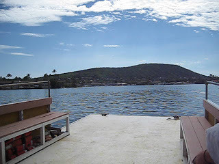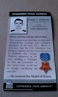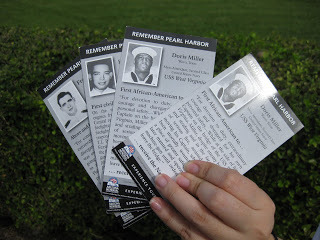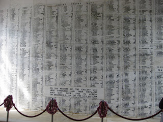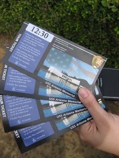 After the hearty breakfast, we rented a car and headed off to Pearl Harbor, the USS Arizona Memorial. We weren't allowed to bring bags into the area, so we had to check them in for $3. This must be a post 9-11 change. The USS Arizona Memorial consists of a film and a ferry ride to the memorial itself constructed over the sunken USS Arizona battleship still filled with the remains of the majority of the soldiers that went down with her on December 7, 1941, sixty-nine years ago. The tickets to the ferry and memorial were not only free, they were nicely done. Each one had a picture of a soldier on it for us to remember.