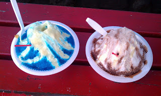 Thanks to some GPS action on my Sprint Evo, we were able to find Waiola Shave Ice in a converted home hidden behind a commercial building. I ordered the blue one, large, which is apparently bigger than Obama's order from Island Snow (his looks like a medium). Mine, the blue one, was vanilla flavored with concentrated milk, pudding, and mochi. My tongue matched my blue shirt afterwards.