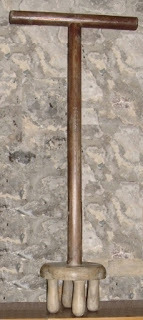 I can well remember watching my grandmother using a posser, and even helping on occasion. It comprised a long stick with a heavy copper disc on the end. Those with three wooden legs were called Dollies: a feminine name perhaps emphasising the woman’s place in the kitchen, just as we often call a drying rack a clothes maiden.
