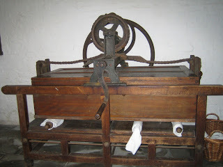 Strong muscles were also a necessity to push and pull the earliest box mangle back and forth with the leather straps or wooden handles. I would surmise that two laundry maids would be required for this task, one at each side. The weight of the box filled with stones, or sand, pressed household linens that were spread flat beneath the rollers, or else were wound about them. The early 19th century saw a variety of newly invented mangles with a system of gears, wheels, and handles which were meant to lighten the laundry maid’s task by helping her to move this box. You could almost view it as an early rotary iron.
