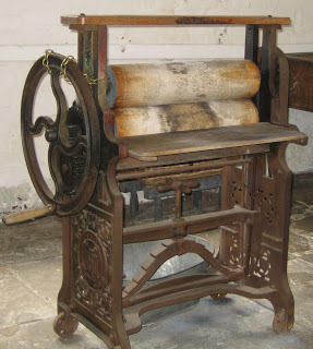 By 1823 we saw the invention of the upright mangle, which took up much less space and was therefore available for use in more humble homes. Mangles also became known as wringers, as rather than smoothing the cloth, they were now mainly expected to simply rid the clothes of water.