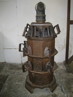 This is a picture of an ironing stove used to heat irons in the laundry of a large country house. Having tested one myself, I’d say the laundry maids would indeed need to have strong arms to even lift one, let alone swish it back and forth over a sheet.