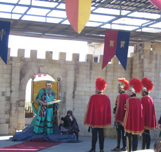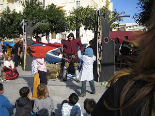 The medieval fool helps the children act out a pay with a dragon, knights and moors. All to rescue a princess, of course. Very like the mummer's play we do in the UK.