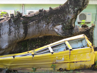 Dominica was lovely, very natural, where we enjoyed a visit to a waterfall, saw a huge banyan tree in the botanical gardens, and a bus that had been flattened in a typhoon. Glad it wasn't ours.