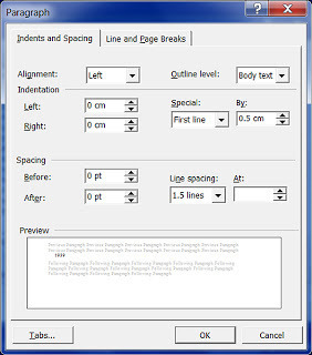 You'll find Format/Style somewhere on your toolbar, depending which version of Word you are using. It will list All Styles available. You might not wish to mess with Normal so choose Body Text or something similar. (I use Body Text First Indent). Stick to one only. You can modify it to the requirements listed above by clicking on font, then paragraph, (see below) and finally choose the language. To add an indent click on Special/First Line, and in the By: box put 0.5