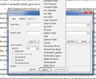 Hyphens which were put in with the ctrl key and found at the end of lines in a print book, can be anywhere on the page of an ebook. They will create a break in the word which irritates the reader. To eliminate them click on Find/More/Special and choose optional hyphen. Leave Replace blank. Click Replace All.