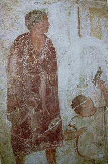 The image is from the Francois Tomb in Vulci, Italy (circa 330BCE). It depicts the aristocratic Vel Saties who is wreathed with laurel and wrapped in a lavish purple cloak bordered with scrolls and embroidered with nude male figures holding shields. The Etruscan is observing a woodpecker in flight while his servant, Arnza, holds a female woodpecker attached by a string to attract the bird back. The woodpecker was sacred to the god of war Laran (Ares/Mars), and it is likely that Vel Saties was consulting the deity before a military encounter.