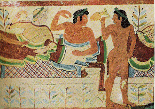 The image is on a banqueting scene from the Tomb of the Leopards in Tarquinia, Italy, 5th BCE. It depicts a husband and wife sharing a dining couch being served wine by a naked slave boy. The woman's skin is pale compared to the ruddy skin of her husband ( an artistic convention of that time). Her hair is fair which may be a realistic detail. The both wear myrtle wreathes. Bright bordered mantles cover the semi naked body of the man and the chiton of the woman. There is an account from a contemporary Greek traveller to Etruria that Etruscan women not only drank wine and share their dining couches with men but also were known to raise toasts. Shocking!