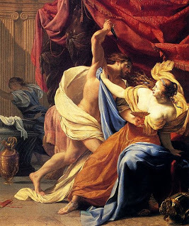 The image is of a painting of the Rape of Lucretia by the C17th painter, Simon Vouet. The story has been inspiration for numerous C6th and C17th painters such as Raphael, Rubens, Tintoretto and Rembrandt. She is a symbol of virtue and self sacrifice triumphing over corruption .