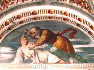 The image is of a painting entitled The Death of Virginia, by the painter Girolamo Romani (Romanino) (c. 1485 – c. 1566) who was an Italian High Renaissance painter. During his long career he decorated the walls of Castello del Buonconsiglio, a castle in Trento, northern Italy. This painting is one of the frescoes that grace that castle's walls