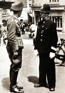 For my story, The Occupation, this photo really struck me. The British ‘Bobby’ or Policeman, talking to a German officer on the streets of Jersey. The British policeman in those days symbolized order, justice and trustworthiness. The German officer wanted to impose the Nazi idea of ‘order’ which included ‘cleansing’ the streets of what they called ‘undesirables’ – Jews, communists, political activists and anyone who opposed their views.