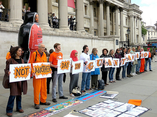 On Friday (May 23), activists around the world held a global day of action — in 39 towns and cities in the US, and six other cities worldwide — calling for the release of prisoners from Guantánamo, and the closure of the prison. The day was set up by my friends in the US-based campaigning group Witness Against Torture, and I was at the London protest, in Trafalgar Square. This was a silent protest organised by the London Guantánamo Campaign, and I’m pleased to make my photos available. The protest, in front of the National Gallery, was seen by many people, and enthusiastic volunteers handed out leaflets explaining why it was so important.