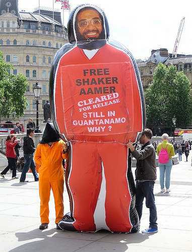 The London protest was also noteworthy for the presence of a giant inflatable figure of Shaker Aamer, the last British prisoner in Guantánamo, which was an idea of mine, taken up by a supporter who financed the making of it. Shaker continues to be held, despite being cleared for release in 2007, under President Bush, and also under President Obama, and there will be further events calling for his release in the near future, which I’ll be publicising in due course. In the meantime, please sign and share the international petition calling for his release, and read some of my most recent articles about him; specifically, From Guantánamo, Shaker Aamer Says, “Tell the World the Truth,” as CBS Distorts the Reality of “Life at Gitmo”, Gravely Ill, Shaker Aamer Asks US Judge to Order His Release from Guantánamo and Shaker Aamer’s Statements Regarding His Torture and Abuse in Afghanistan and at Guantánamo.