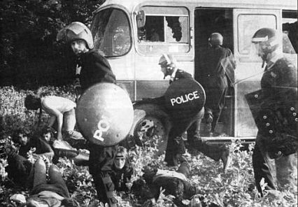 Cornered in a field by the A303, the convoy members — including women and children — were eventually set upon by the police in a distressingly violent manner, albeit one that was typical of life under Thatcher, bearing remarkable similarities to the violence meted out to the miners at Orgreave, in South Yorkshire, the year before.