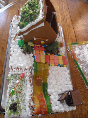 We were challenged to a gingerbread house contest. Two families. Two kits. Add any materials you want, as long as they're edible.