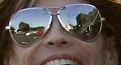He's wearing camoflauge pants, a Ghostbusters t-shirt and a stringy beard. He's wearing mirrored sunglasses. Inside Wal-Mart.
