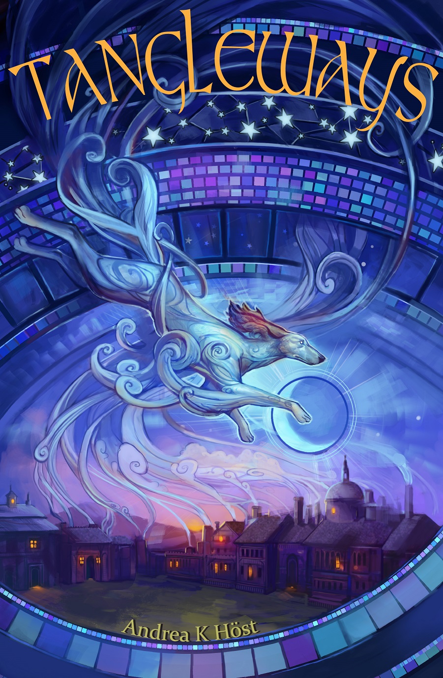No-one is going to be surprised to discover that the Cwn Annwn are a factor in Tangleways after this cover. :D I asked Julie to use salukis as the model - and this hound of death is just as gorgeous and strange as I hoped. [DWJ's Dogsbody was one of the major inspirations for the Trifold world.]