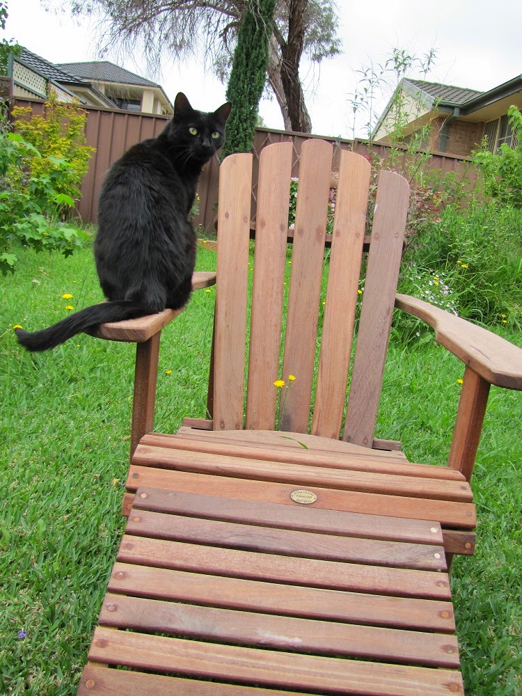 Pepper is black, and her coat is neither short nor long, and right now it is very thick because she likes to sleep outside. Pepper is a rescued stray, and thinks piles of grass clippings make lovely beds - though she's settled down to using a cat bed on the back patio. If you move when she's near she will jump away, in case you might happen to feel like kicking her, but she loves to be petted, and her curling tail spins and whirls.