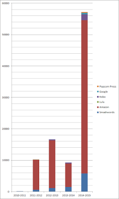 And, really, woohoo! That's a lot of money! A pity it's going to drop by about $20,000 in the current financial year (gauging from current sales/publication rates), but this is still a good deal better than I expected from my five-year check-in on the state of my self-publishing career.