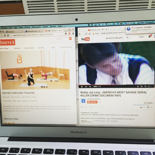 My workout formula: online Barre workouts while watching serial killer documentaries. #fitness #morbidfascination #mommytime