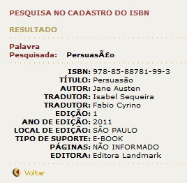 em recente cadastramento da obra persuasão em formato ebook junto à agência brasileira do isbn, na fundação biblioteca nacional, a editora landmark incluiu o devido crédito da tradução a isabel sequeira. cabe notar que o nome de fábio cyrino agora consta como coautor da tradução: como aparentemente o ebook é uma réplica digital da edição impressa de 2007, a responsabilidade de fábio cyrino nessa coautoria talvez diga respeito às leves alterações na tradução portuguesa de isabel sequeira, quando foi publicada em livro em seu nome.