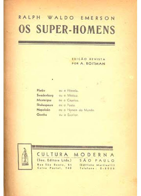 Esse volume surgiu inicialmente entre nós com o nome de Os super-homens. Foi lançado pela Cultura Moderna, efêmera editora paulista (1934-1938) criada pelo jornalista, escritor e tradutor Galeão Coutinho, numa edição sem data, que calculo por volta de 1936. [Note-se que o ensaio inicial, "Uses of Great Men", não consta na listagem da página de rosto. Não consultei fisicamente o exemplar; é provável que o texto venha como ensaio introdutório.]