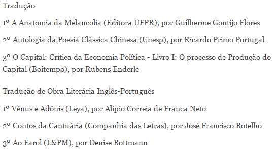 aqui os finalistas para o prêmio jabuti de tradução literária, categoria especial inglês/português (tive a honra de ser incluída com ao farol, de virginia woolf, pela l&pm):