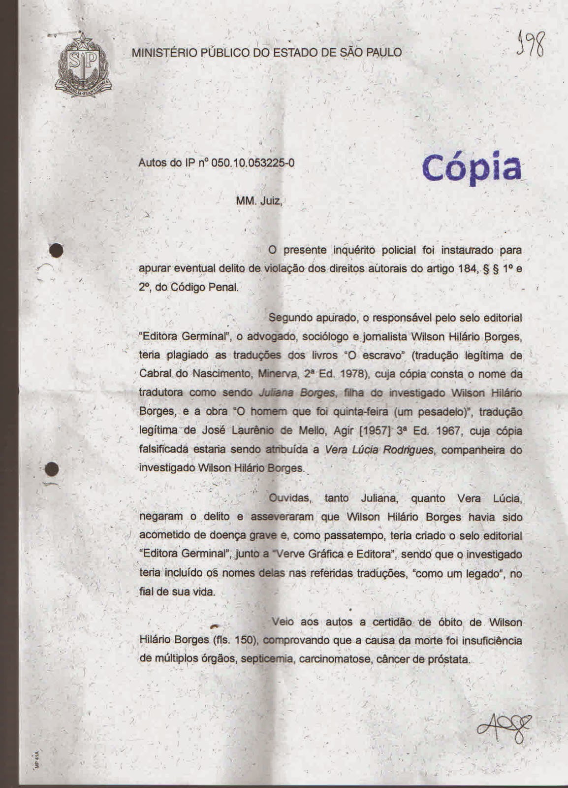 hoje recebi os seguintes informes sobre o inquérito policial por estelionato em curso contra a editora germinal por fraudes de tradução (acompanhe o caso aqui):