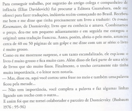visto que não se encontra nenhuma notícia de alguma edição de os irmãos karamazov publicada diretamente pela guanabara, sinto-me fortemente tentada a crer que a discrepância na referência ao nome da editora (americana, e não guanabara) se deve ao fato de que o catálogo literário da editora americana passou, em 1931, para a waissman, reis & cia., a qual por sua vez, a partir de 1934, passa a responder pelo nome de guanabara (e também guanabara koogan). essa hipótese é reforçada também pelo fato de que elias davidovitch, o amigo e companheiro citado por leôncio basbaum, desde 1930 fazia traduções para a americana, bem como para a posterior guanabara. em resumo, suponho que leôncio basbaum, em suas memórias, referiu-se à americana pelo nome que, entre uma e outra fusão editorial, ela veio a adotar poucos anos depois e que mantém até a data de hoje.