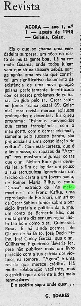 no mesmo letras e artes, o suplemento literário dominical do jornal carioca a manhã, encontrei na edição de 5 de janeiro de 1947 uma referência à revista agora, de goiânia, em seu ano I, número 1, agosto de 1946, que teria publicado a historieta "cruza", extraída do volume as metamorfoses (sic). estou tentando localizar a referida revista: por ora, sei apenas que foi criada por oscar sabino jr. e afonso félix de sousa. em a localizando, provavelmente poderia ser apontada como a primeira tradução de algo de kafka no brasil, até eventuais novas descobertas ulteriores.
