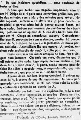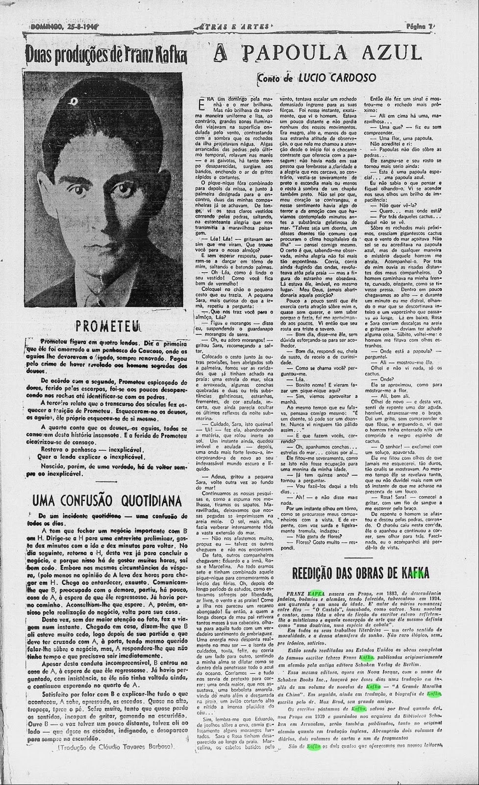 em pesquisa em nossa hemeroteca nacional, localizei duas parábolas de kafka traduzidas por cláudio tavares barbosa e publicadas em letras e artes, o suplemento literário dominical do jornal carioca a manhã, em 25 de agosto de 1946.
