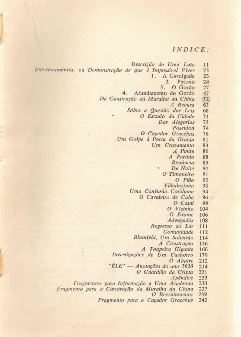 outro volume importante, a muralha da china, em tradução de torrieri guimarães, publicado pela livraria exposição do livro, sem data, provavelmente 1964, de todo modo certamente anterior à publicação d'a colônia penal pela mesma editora (ver aqui), baseou-se também numa edição da argentina emecé, publicada em 1953, em tradução de alfredo pippig e alejandro ruiz guiñazú, na coleção "grandes novelistas", com o título de la muralla china: cuentos, relatos y otros escritos. seu conteúdo corresponde ao quinto volume de gesammelte schriften, em organização de max brod, publicado em 1936 pela h. mercy sohn, que leva o título de beschreibung eines kampfes: novellen, skizzen, aphorismen aus dem nachlass.