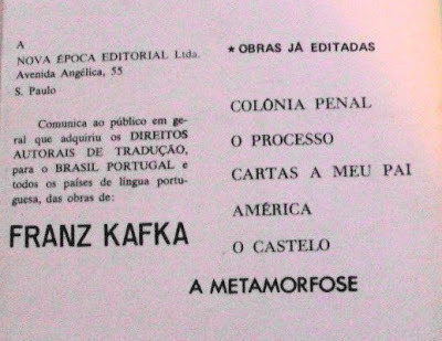 a nova época, infelizmente, não trazia data de publicação. só posso afirmar que os lançamentos de kafka são posteriores a 1971, visto constar código de endereçamento postal no endereço da editora em seus volumes (e o cep foi criado pelos correios apenas em maio de 1971). posso afirmar também que foi na mesma época em que a telefônica fez a transição dos números de telefone de seis para sete dígitos em são paulo, visto constarem dois números de telefone da editora, um ainda com seis, outro já com sete dígitos (a saber, 826-8751 e 66-7423) - mas não sei quando se deu essa transição, que nos permitiria afunilar melhor o período de publicação.