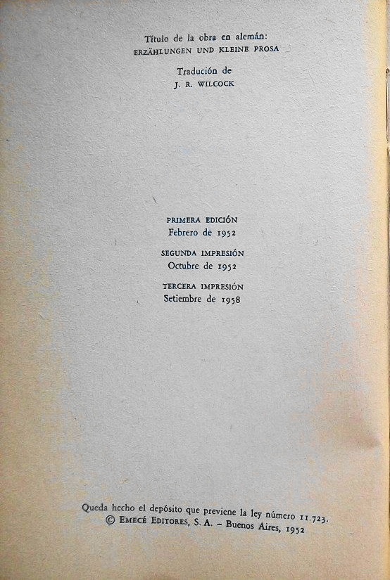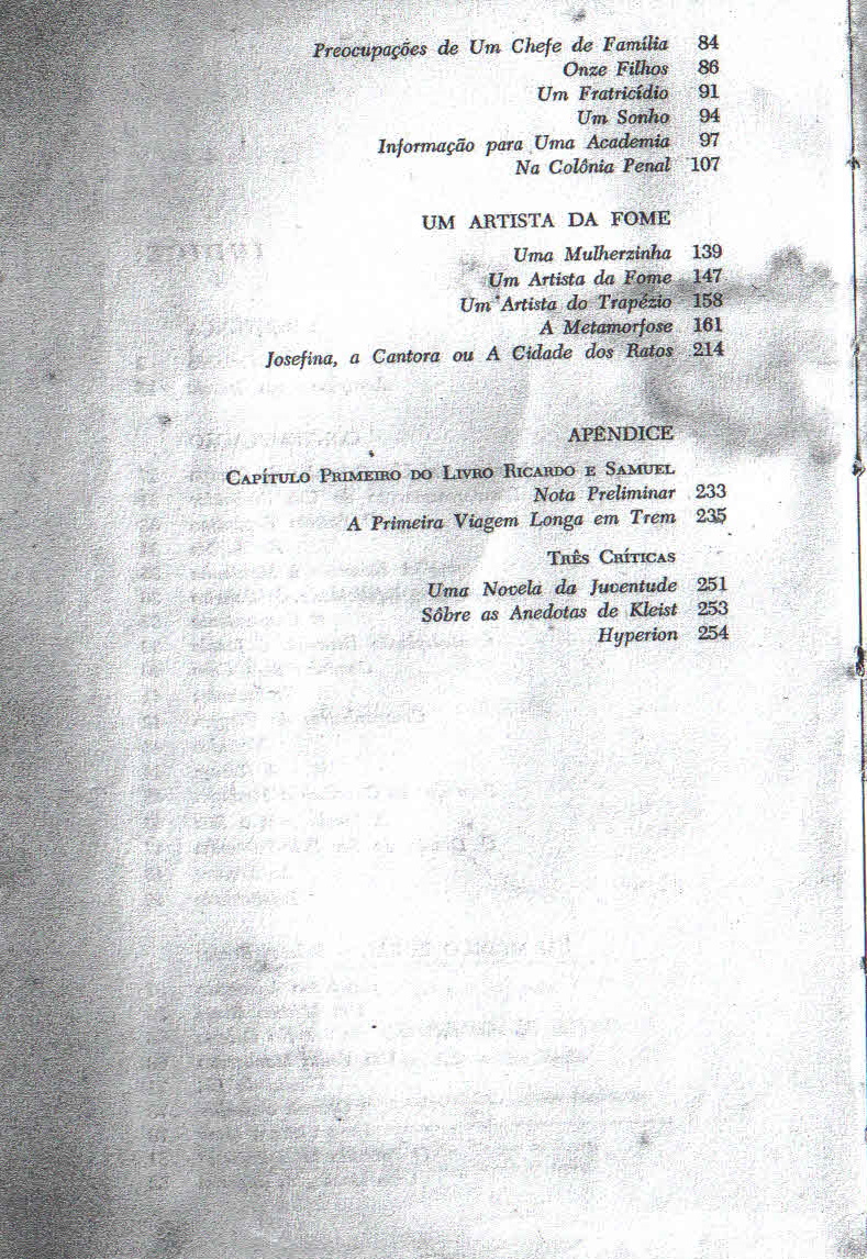 há, porém, algumas diferenças de conteúdo: primeiro, a omissão de "descrição de uma luta", que foi publicada no volume d'a muralha da china, também em tradução de torrieri guimarães; segundo, e muito interessante, a inclusão de "a metamorfose", "um artista da fome" e "um artista do trapézio", contos para os quais torrieri recorreu às pretensas traduções de jorge luis borges, estrambótica novela que já comentei extensamente em posts anteriores.