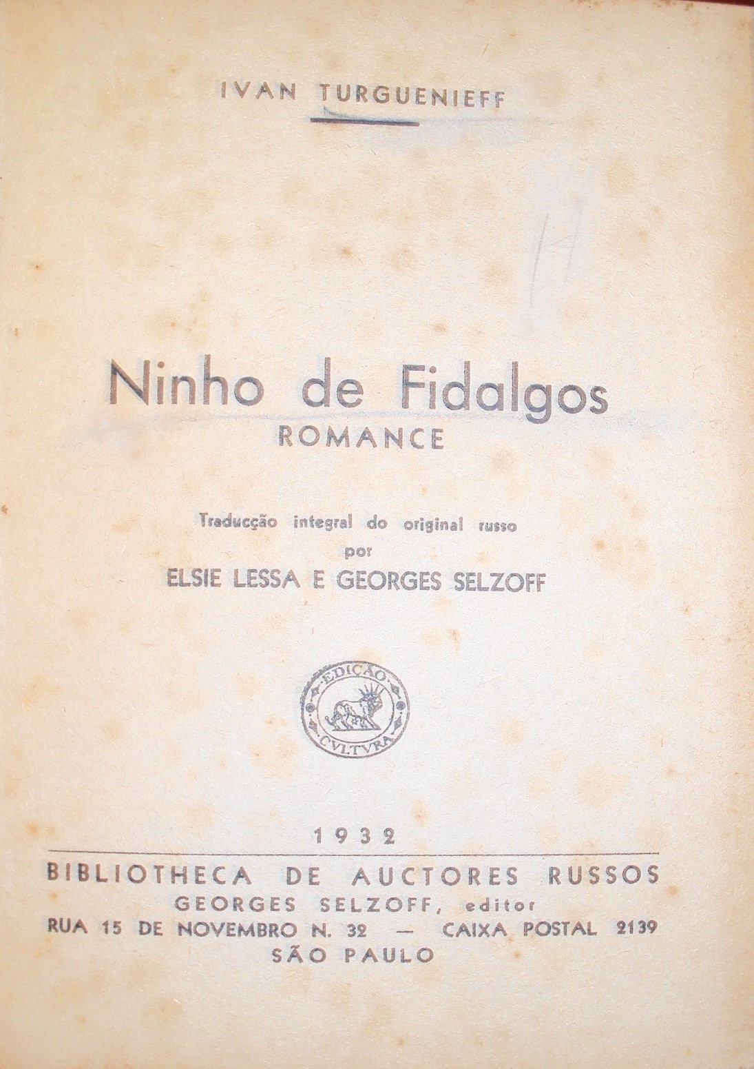 Ninho de fidalgos. Trad. Elsie Lessa e Georges Selzoff. Coleção “Bibliotheca de Auctores Russos”. São Paulo: Cultura, 1932.