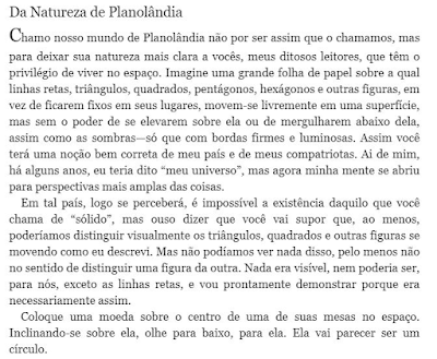 Imagine uma grande folha de papel sobre a qual linhas retas, triângulos, quadrados, pentágonos, hexágonos e outras figuras, em vez de ficarem fixos em seus lugares, movem-se livremente em uma superfície, mas sem o poder de se elevarem sobre ela ou de mergulharem abaixo dela, assim como as sombras - só que com bordas firmes e luminosas. Assim você terá uma noção bem correta de meu país e de meus compatriotas. Ai de mim, há alguns anos, eu teria dito "meu universo", mas agora minha mente se abriu para perspectivas mais amplas das coisas.