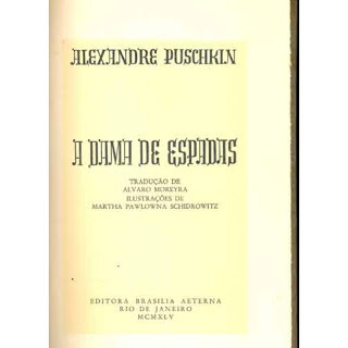 em 1945, álvaro moreyra lança sua tradução d'a dama de espadas pela brasilia aeterna, aliás com tiragem especial em 1944 para a confraria de bibliófilos brasileiros cattleya alba, numa edição numerada de luxo, com capa de seda e ilustrações de martha schidrowitz feitas a mão: