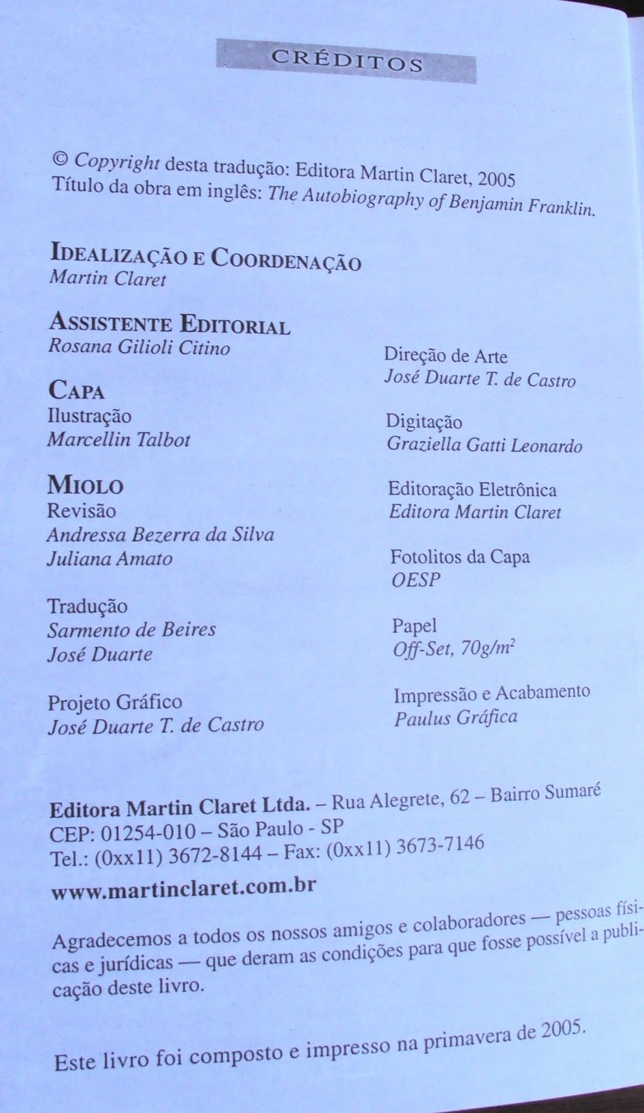 a tradução d'a autobiografia de benjamin franklin, feita pelo português sarmento de beires, com josé duarte, saiu em 1950 pela coleção de clássicos da extinta editora jackson. não consigo imaginar como o copyright dela teria ido parar nas mãos da editora martin claret.