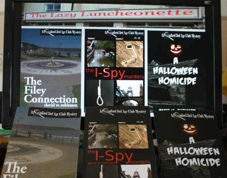 So here you are. All three STAC Mysteries propped up in front of the machine upon which they were created, while the machine shows the same covers, topped off with the exterior of the Lazy Luncheonette.