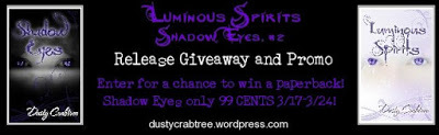 Psst! Dusty Crabtree is having a giveaway. One lucky winner will win a print copy of Shadow Eyes or the sequel, Luminous Spirits, 3 will get the ebook version.