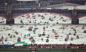 She remained on her feet during the entire river pageant — some 5 hours long — and never stopped waving at people. (Her wrist must ache like hell, as must her feet.)
