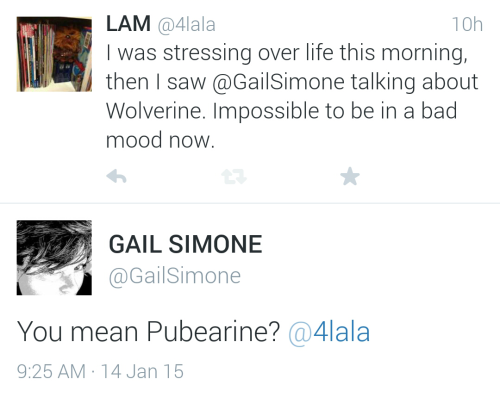 For that time I was having a rough morning but gailsimone was discussing Wolverine’s pubes on Twitter and tweeted “Pubearine” at me (yes, I screenshot & saved the moment forever), completely changing the course of my day, and for countless other moments where she has made me laugh, inspired, and added so much to the world of comics and beyond, I wish Gail the happiest of birthdays and thank her for being so damn awesome.